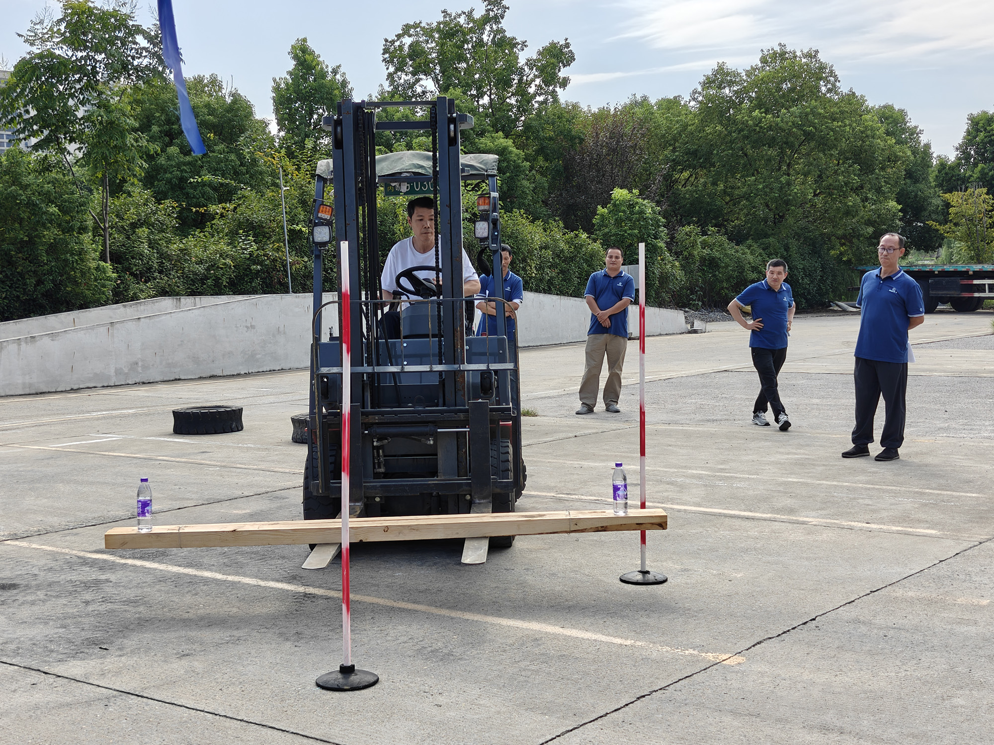 叉車技能比武側(cè)重于選手的操控熟練性與心理素質(zhì)。項目設(shè)置緊密貼合實際作業(yè)場景,要求選手在限定時間內(nèi)完成轉(zhuǎn)向往返、托盤精準(zhǔn)移庫碼放等動作,并在繞障礙物操作過程中確保托盤上礦泉水瓶保持穩(wěn)定,不得掉落。競賽不僅要求速度,更注重操作的平穩(wěn)性與準(zhǔn)確性,充分體現(xiàn)出高標(biāo)準(zhǔn)的作業(yè)要求。